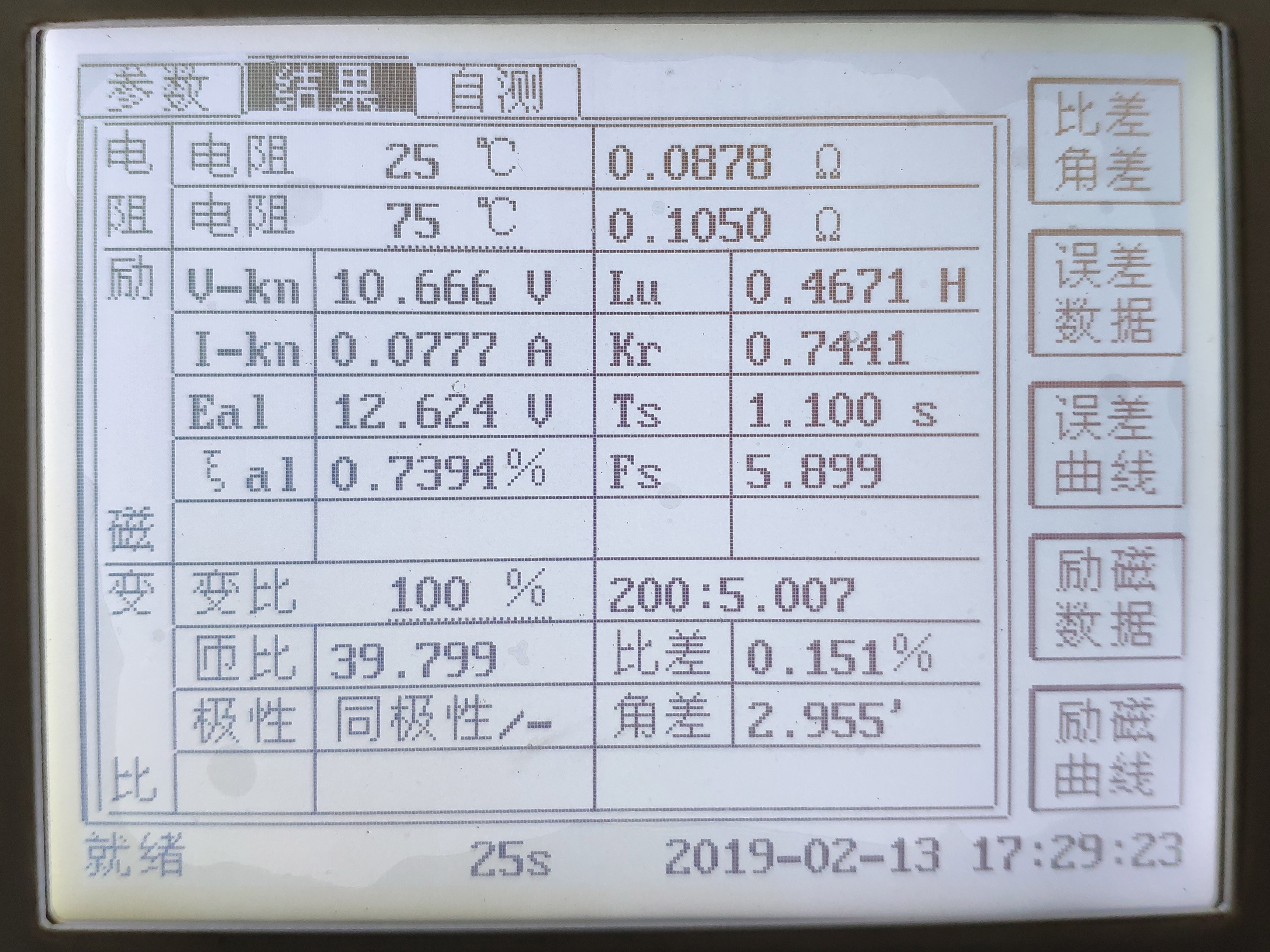 該電流互感器合格標準要求角差0.5級,比差不超過30′,同極性,實測結(jié)果比差0.15%、角差2.96′,極性相同。