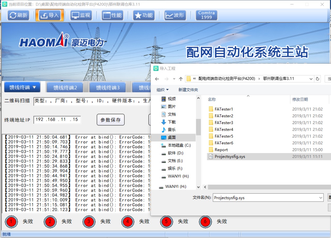 點(diǎn)號(hào)配置完成后進(jìn)入配網(wǎng)測(cè)試界面,點(diǎn)擊導(dǎo)入,選擇保存的配置文件,然后設(shè)置終端IP(此次試驗(yàn)終端IP為192.168.11.15),點(diǎn)擊參數(shù)保存,待下方黃燈閃亮即表示測(cè)試儀與FTU通訊成功。