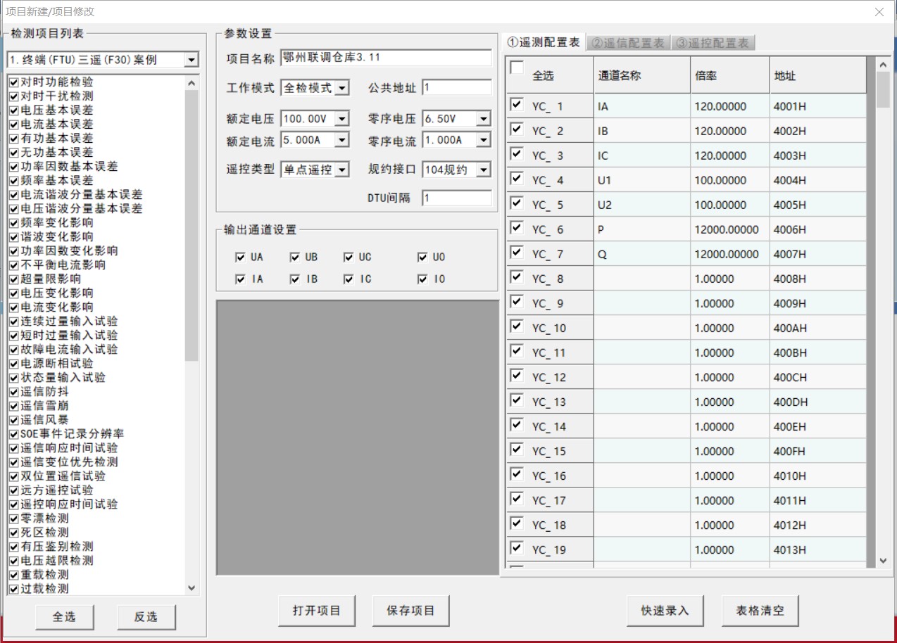 將FTU內(nèi)部設(shè)置完成的點(diǎn)號(hào)與測(cè)試儀點(diǎn)號(hào)對(duì)應(yīng)。測(cè)試儀的點(diǎn)號(hào)為標(biāo)準(zhǔn)十六進(jìn)制碼,(遙測(cè)的4001H代表遙測(cè)點(diǎn)號(hào)1,遙信點(diǎn)號(hào)0001H代表遙信點(diǎn)號(hào)1,遙控6001H代表遙控點(diǎn)號(hào)1)。對(duì)于部分舊版本FTU,點(diǎn)號(hào)可能從0開始,需要我們將測(cè)試儀點(diǎn)號(hào)整體挪位(即FTU的IA為0,IB為1,IC為2,此時(shí)測(cè)試儀對(duì)應(yīng)的IA為4001H,IB為4002H,IC為4003H),將遙信、遙測(cè)、遙控、點(diǎn)號(hào)配置完畢后保存項(xiàng)目。