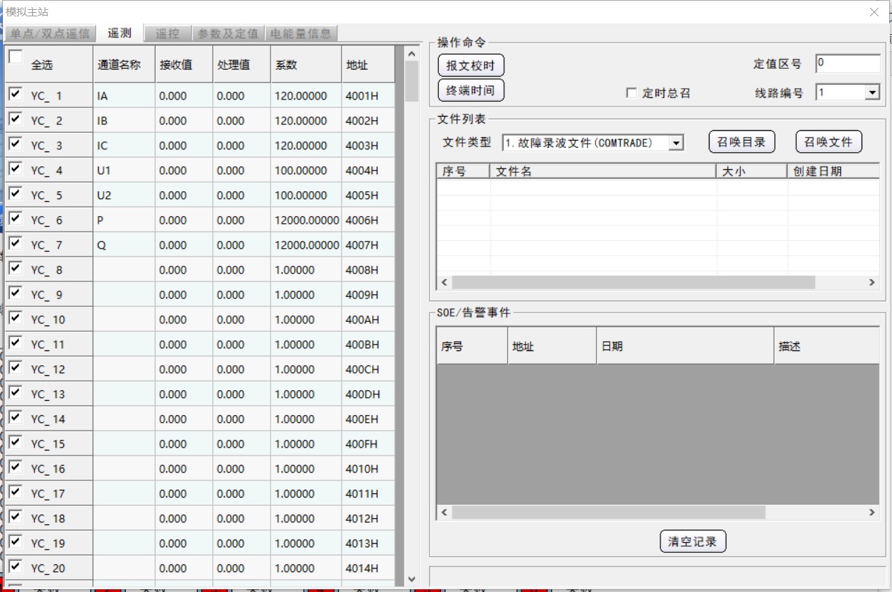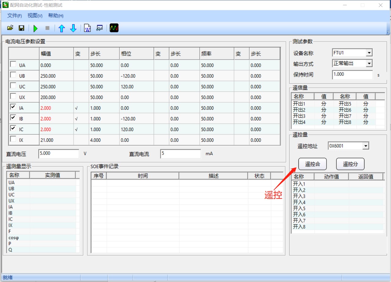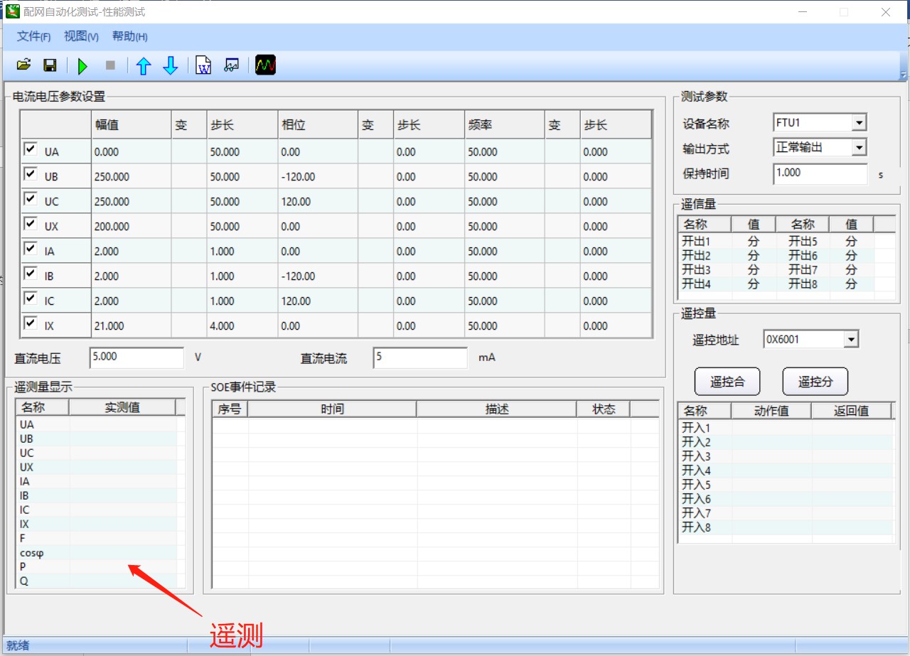 遙測(cè):測(cè)試儀輸出電流電壓值至FTU,通過通訊端口回采電流電壓、有功無功等遙測(cè)值。