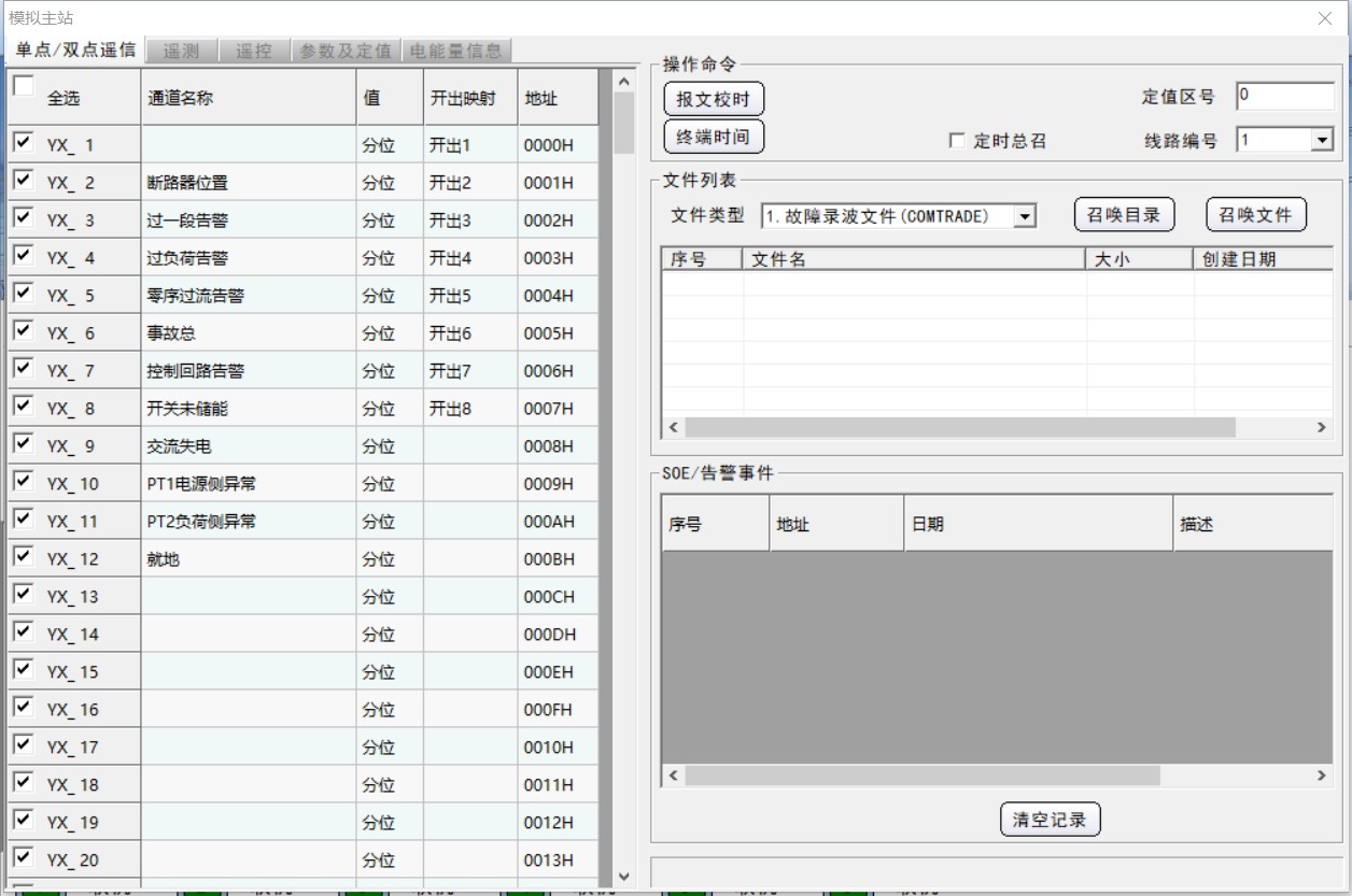 遙信:此次試驗(yàn)沒有將測(cè)試儀的開出直接接入終端控制各狀態(tài)位置,需要在終端手動(dòng)改變斷路器位置、儲(chǔ)能、就地等位置,在監(jiān)控界面查看回采遙信值。