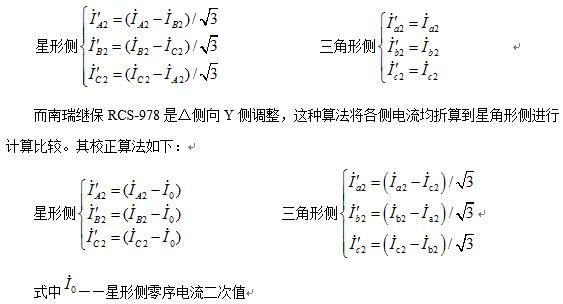 此時國電南自PST-1200和南瑞繼保的RCS-978就有些不同了,主要是在補(bǔ)償電流相位調(diào)整方式不同。目前國內(nèi)大多數(shù)保護(hù)廠家都是Y側(cè)向△側(cè)調(diào)整,這種算法將各側(cè)電流均折算到三角形側(cè)進(jìn)行計算比較。其校正算法如下: