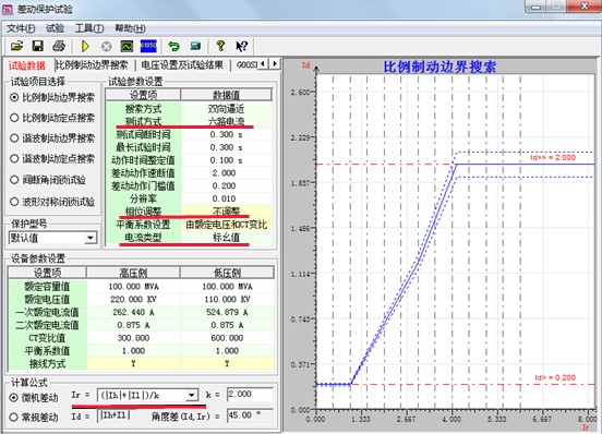 然后我們再以RCS-978的高對低壓側(cè)差動為例來說明試驗方法,RCS-978的保護(hù)定值如下:高中低壓側(cè)額定容量為100MVA,電壓等級為220kV/110kV/10kV,CT變比分別為300/1、600/1、3000/1,差動電流0.3Ie,速斷電流4Ie,拐點1制動電流0,拐點2制動電流0.5Ie,拐點3制動電流6Ie,斜率分別為0.2、0.5、0.75,(Ie為高壓側(cè)二測額定電流)制動公式為Ir = ( | Ih | + | Il | ) / 2,主變接線方式為Y/Y0-△11。