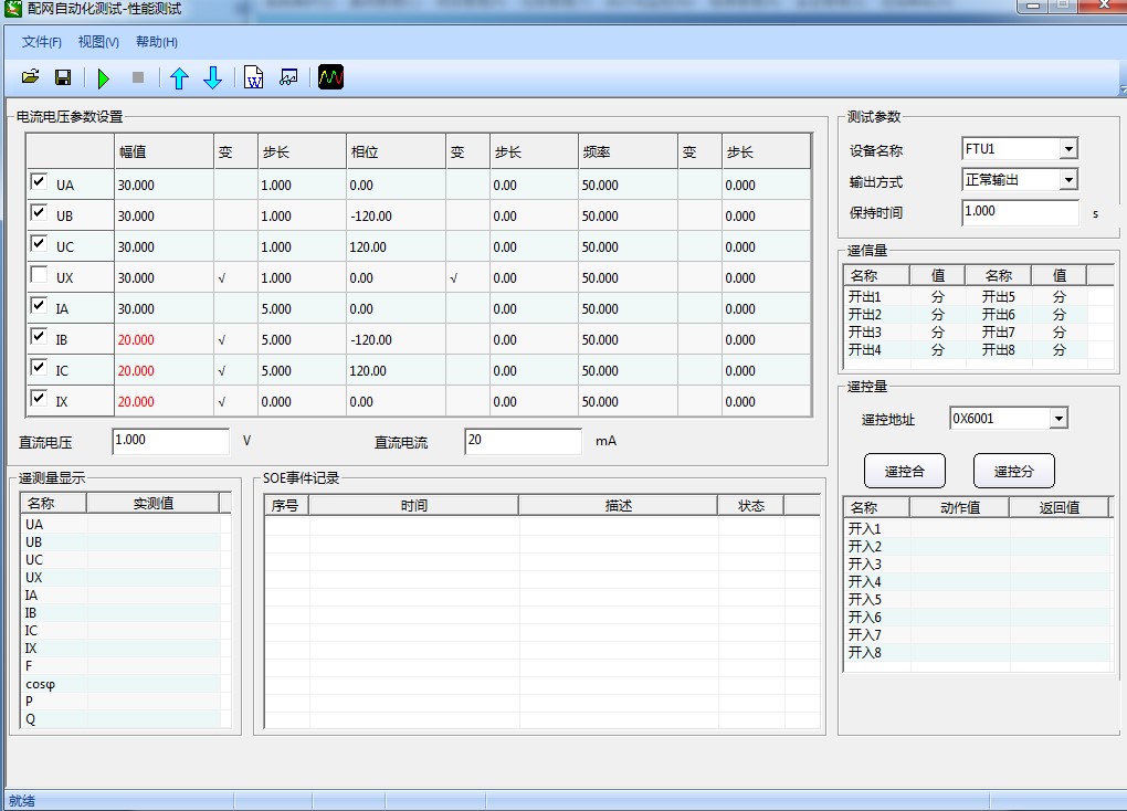 配電之星-P2200 可根據(jù)測試參數(shù)輸出方式,在界面選擇正常的通道電壓電流輸出、合成輸出、直流輸出、遙測值顯示,通過獲取配電終端的遙信及SOE數(shù)據(jù),實現(xiàn)對配電終端遙信可靠性、遙信防抖、SOE分辨率等功能檢測。