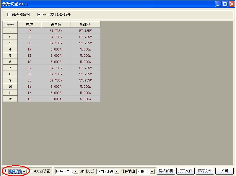 2) 點(diǎn)擊標(biāo)題欄中“61850”按鍵,進(jìn)入?yún)?shù)設(shè)置界面,選擇左下角“功放輸出”,表示繼保儀輸出為模擬量電流電壓信號(hào),然后直接點(diǎn)擊右下角關(guān)閉即可。