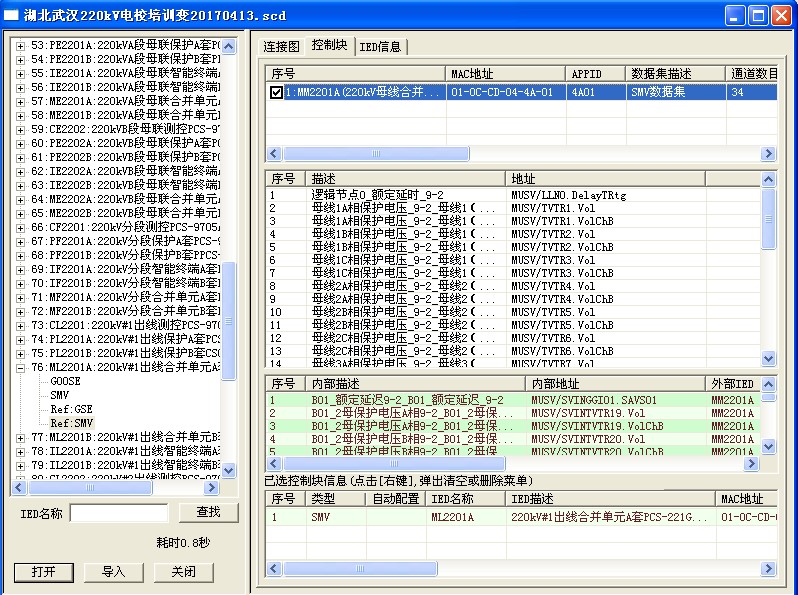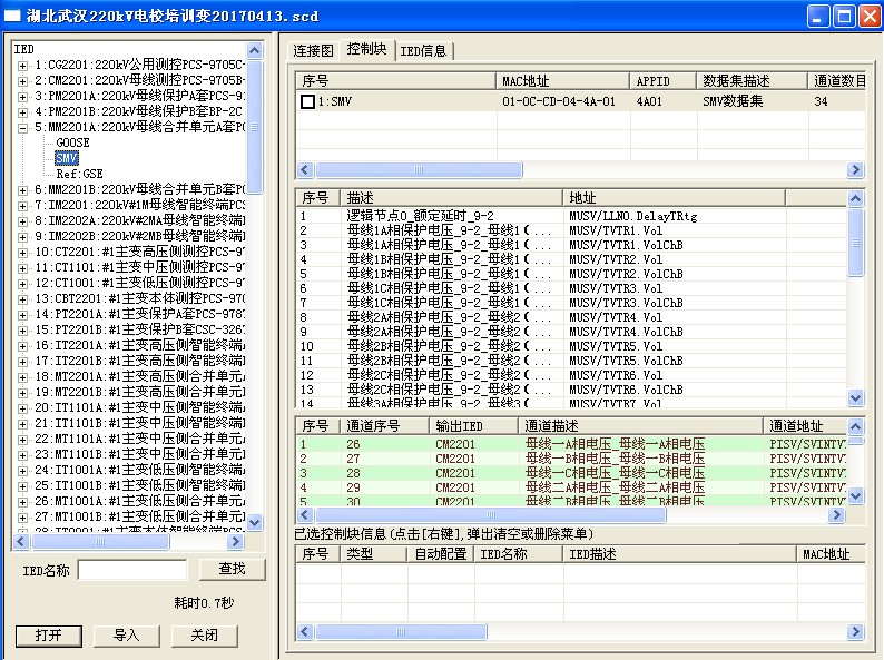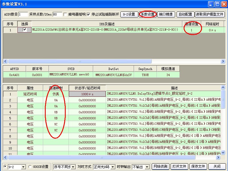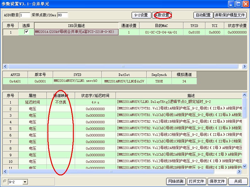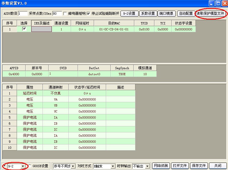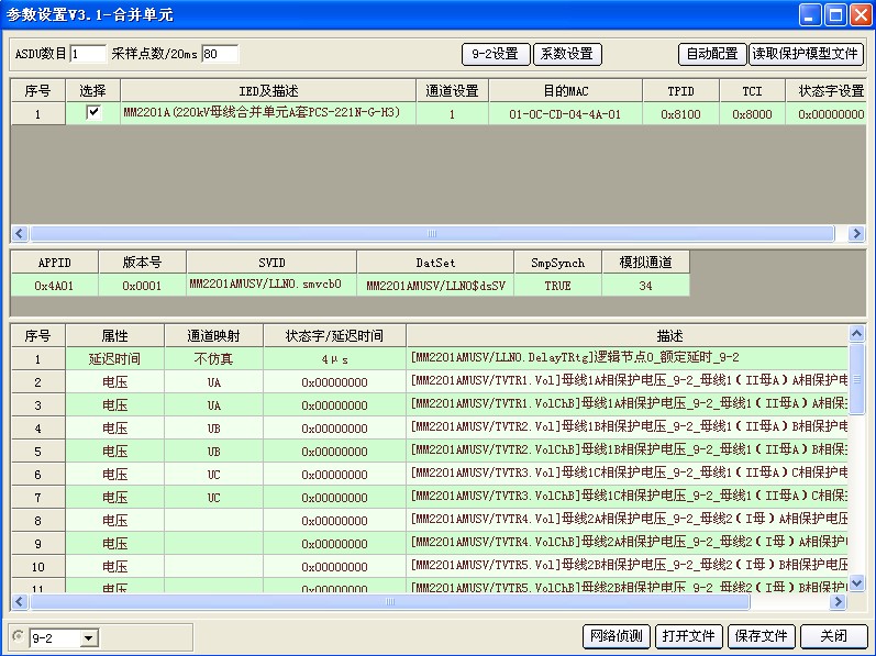 此界面需要配置母線PT合并單元輸出的數(shù)字信號(hào)配置給繼保儀,點(diǎn)擊上圖右上角“讀取保護(hù)模型文件”導(dǎo)入此合并單元輸出SV控制塊。