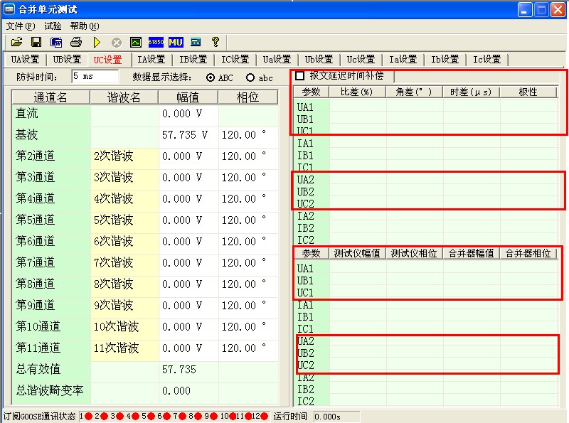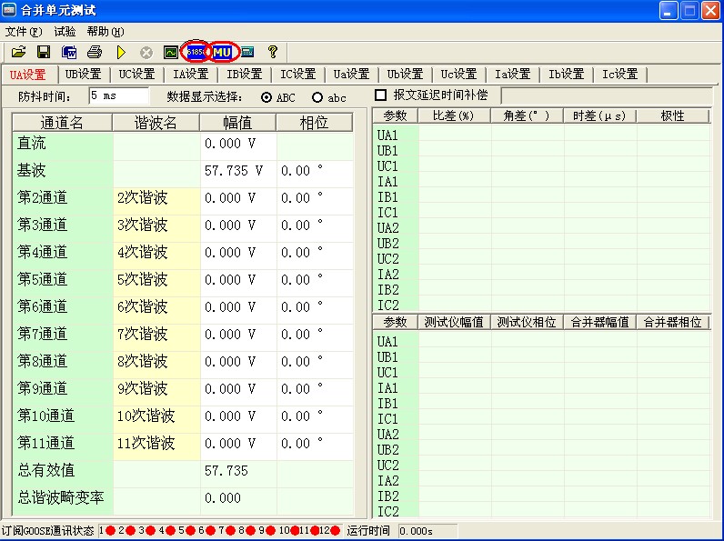 6)點(diǎn)擊右下角“關(guān)閉”即完成所有配置,接一組電壓信號(hào)電纜和一根數(shù)字信號(hào)光纖,設(shè)置對(duì)應(yīng)的UA、UB、UC基波電壓值(默認(rèn)57.735V)即可開始試驗(yàn),其他諧波通道可以不設(shè)置。