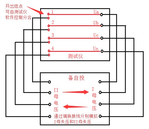 將Ua、Ub、Uc接入I母電壓輸入端子,在手持式繼保儀的電壓輸出端子并聯(lián)出一組電壓線,接在繼保儀的開出接點(diǎn),再由繼保儀開出接點(diǎn)的另一端接入II母電壓。 此時(shí) 繼保儀的開出接點(diǎn)充當(dāng)一個(gè)三相空開,可以由軟件控制分合,模擬II母有壓和失壓。 需 要模擬I母有壓、失壓時(shí),將接在備自投裝置端子排的兩組電壓線調(diào)換即可。