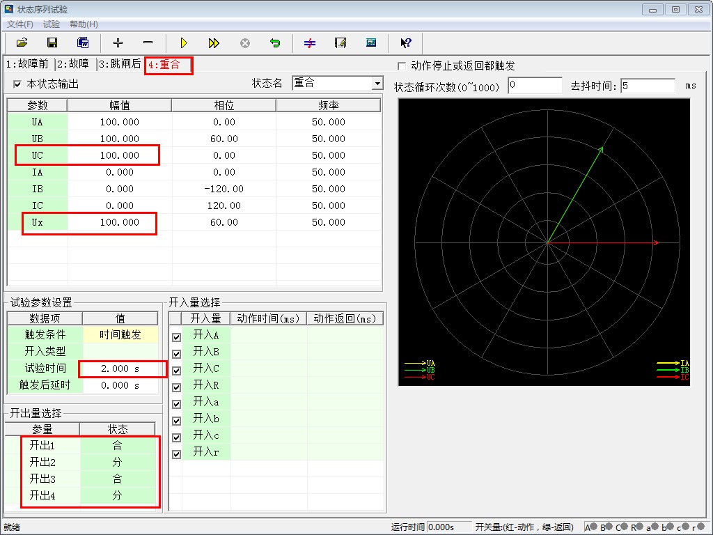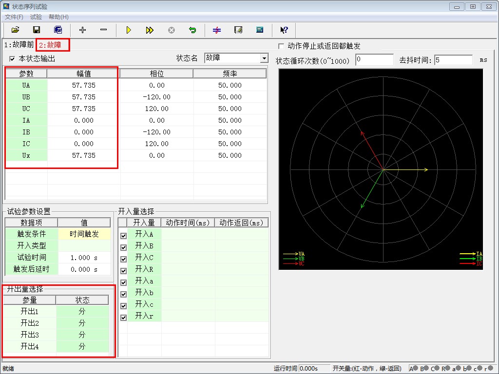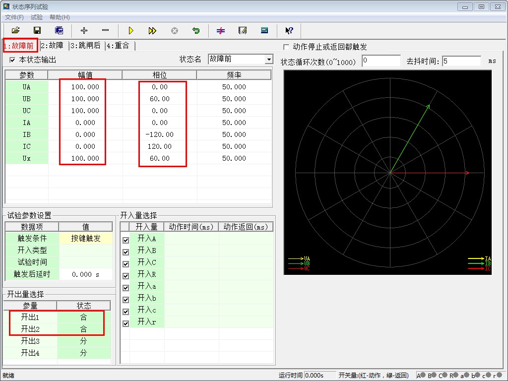 1)故障前。 UA和UB將模擬I母電壓,幅值均設(shè)置為100V、相位相差60°; UC和UX將模擬II母電壓,幅值均設(shè)置為100V、相位相差60°。 因 繼保儀的開出1、2分別接DL131、DL231的合位信號(HWJ),設(shè)置開出1、2狀態(tài)為閉合,表示進(jìn)線DL131、DL231斷路器都處于合位。