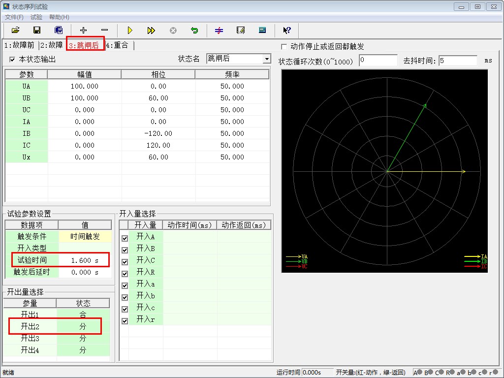 2)故障態(tài)。 UC和UX電壓設(shè)置為0表示II母失壓,假設(shè)備自投裝置跳閘延時(shí)1s,則狀態(tài)二的輸出時(shí)間要比定值大0.1s。 進(jìn)入此狀態(tài)時(shí),備自投裝置還未給DL231斷路器發(fā)跳閘命令,故DL131、DL231仍為合位,開出1、2狀態(tài)仍為閉合。