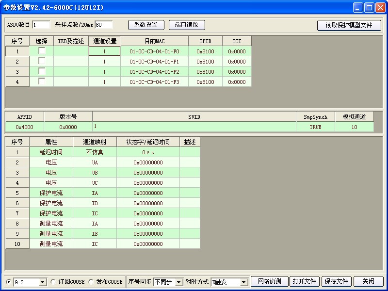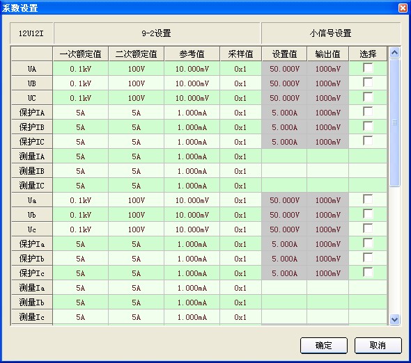設(shè)置系統(tǒng)的一次額定值、二次額定值、參考值、采樣值和小信號信息, 輸出通道有UA、UB、UC、保護IA、保護IB、保護IC、測量IA、測量IB、測量IC、Ua、Ub、Uc、保護Ia、保護Ib、保護Ic、測量Ia、測量Ib、測量Ic和UU、UV、UW、保護IU、保護IV、保護IW、測量IU、測量IV、測量IW、Uu 、Uv、Uw、保護Iu、保護Iv、保護Iw、測量Iu、測量Iv、測量Iw共36路。