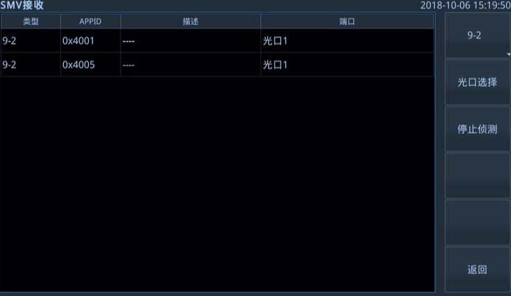 SMV控制塊是描述IED將模擬量往外發(fā)送的能力,將需要發(fā)送的模擬量實例化為不同的LN,將其匯總至發(fā)送數(shù)據(jù),數(shù)據(jù)集再關聯(lián)至Smvcb。 在NSA-60 設備端口進入“SMV接收”界面,點擊“偵測”按鈕,首先偵測各光口是否接入光纖,未接入光纖的光口將給出提示,接下來進行偵測,將偵測結(jié)果顯示在界面,點擊任意一個APPID的SMV,即可查看有效值。