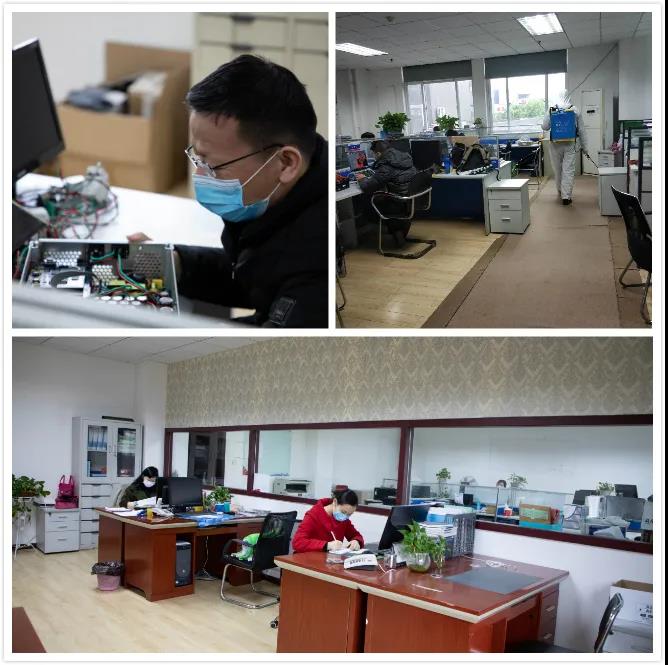 5)辦公室調(diào)整: 辦公區(qū)域重新調(diào)整了工位,確保工作間隔一米以上。 消毒組每日多次對辦公區(qū)域和公共區(qū)域進行全方位、無死角消毒,及時開窗通風保證空氣流通。