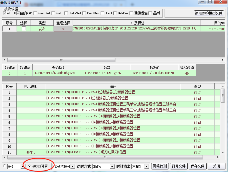 2)輸出配置 。 點擊上圖GOOSE設(shè)置,然后點擊右上角“讀取模型文件”導(dǎo)入SCD文件。