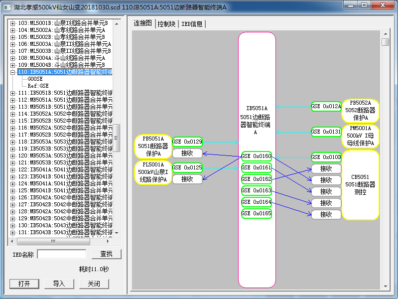 圖中右側(cè)為智能終端裝置信息圖,點擊IED對應(yīng)序號疊加符號。 “GOOSE”表示該IED發(fā)送的GOOSE信息,點擊右側(cè)列表顯示對應(yīng)信息; “Ref: GSE”表示該IED接收的GOOSE信息,點擊右側(cè)列表顯示對應(yīng)信息。 此處需配置“Ref: GSE”。