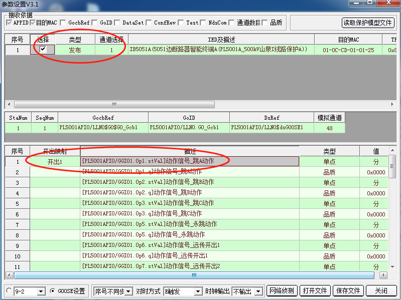 配置時需注意以下三點: ①繼保之星-6000C 模擬保護發(fā)GOOSE至智能終端,此類型應(yīng)為發(fā)布; ②通道選擇為光纖1口; ③跳閘信號為通道1映射為開出1。