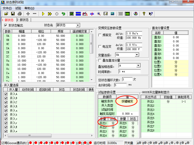 1)進入“狀態(tài)序列”軟件主界面,設(shè)置兩個狀態(tài),狀態(tài)一設(shè)置: 開出1“分”,按鍵觸發(fā); 狀態(tài)二設(shè)置: 開出1“合”,開關(guān)量觸發(fā)。