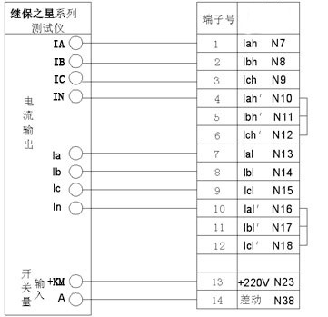 高壓側(cè)電流由繼保之星-7000A 的IA、IB、IC、IN接到保護(hù)裝置高壓側(cè)CT繞組,低壓側(cè)電流由測試儀Ia、Ib、Ic、In接到保護(hù)裝置低壓側(cè)繞組,將開入量A接到保護(hù)裝置跳閘出口。