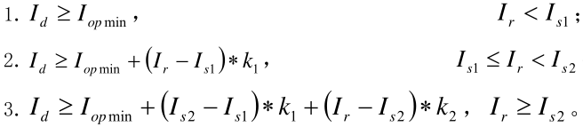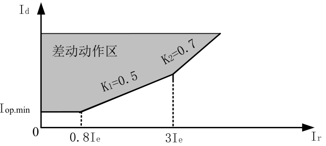 Id-差動電流,Ir-制動電流,Iop.min-最小動作電流(定值單為0.4Ie),Is1-制動電流拐點(diǎn)(0.8Ie),Is2-制動電流拐點(diǎn)2(取3Ie); K1=0.5,K2=0.7,Ie-基準(zhǔn)側(cè)額定電流。