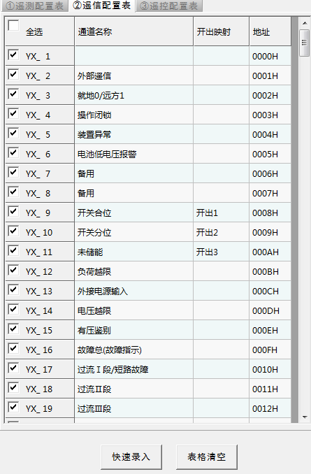 (4)遙信配置表: 根據(jù)主站提供的點表將遙信描述填入通道名稱(也可將主站提供的遙信點表復(fù)制,點擊快速錄入粘貼至表格),進(jìn)行開出映射,合位映射開出1、分位映射開出2、未儲能映射開出3。