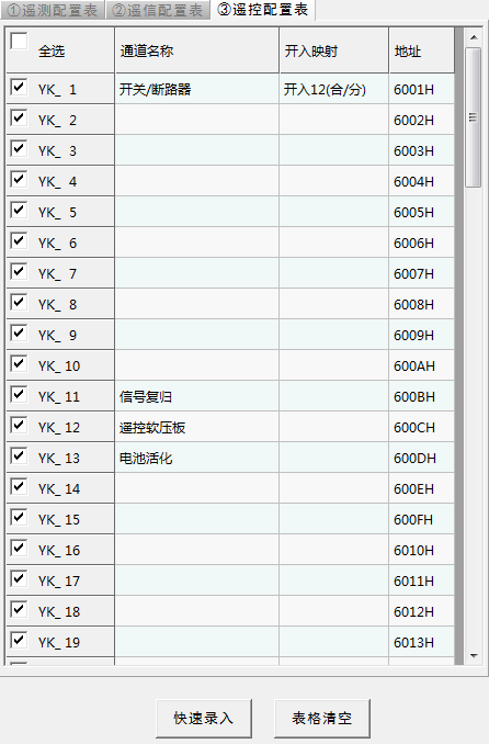 (5)遙控配置表: 根據(jù)主站提供點表將遙控描述填入通道名稱內(nèi),也可將主站提供的遙控點表復(fù)制,點擊快速錄入粘貼到表格,然后進(jìn)行開入映射,在開關(guān)或斷路器映射“開入1 2(合/分)”。