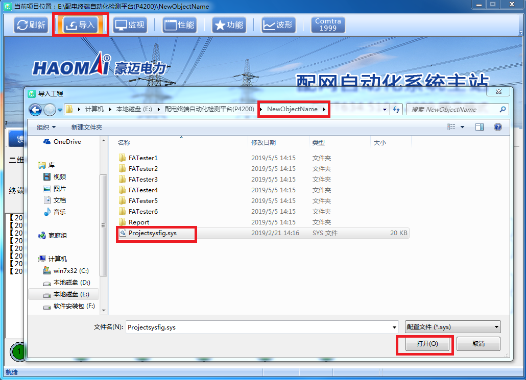 按要求完成參數(shù)設(shè)置,點擊“保存項目”并退出。 打開“配網(wǎng)測試”,點擊“導(dǎo)入”,打開項目管理保存的工程項目名稱,選擇“Projectsysfig.sys”,點擊打開。