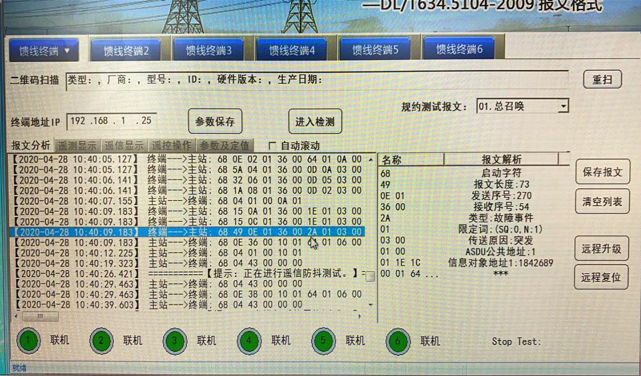 用掃碼槍掃入裝置型號編碼等(也可手動輸入),在終端地址IP欄輸入對應(yīng)測試終端IP,點擊參數(shù)保存并刷新,等待10s左右,下側(cè)對話框出現(xiàn)報文,則表示自動連接成功,確認(rèn)報文無異常后點擊“進(jìn)入檢測”即可進(jìn)行一鍵式自動化測試。