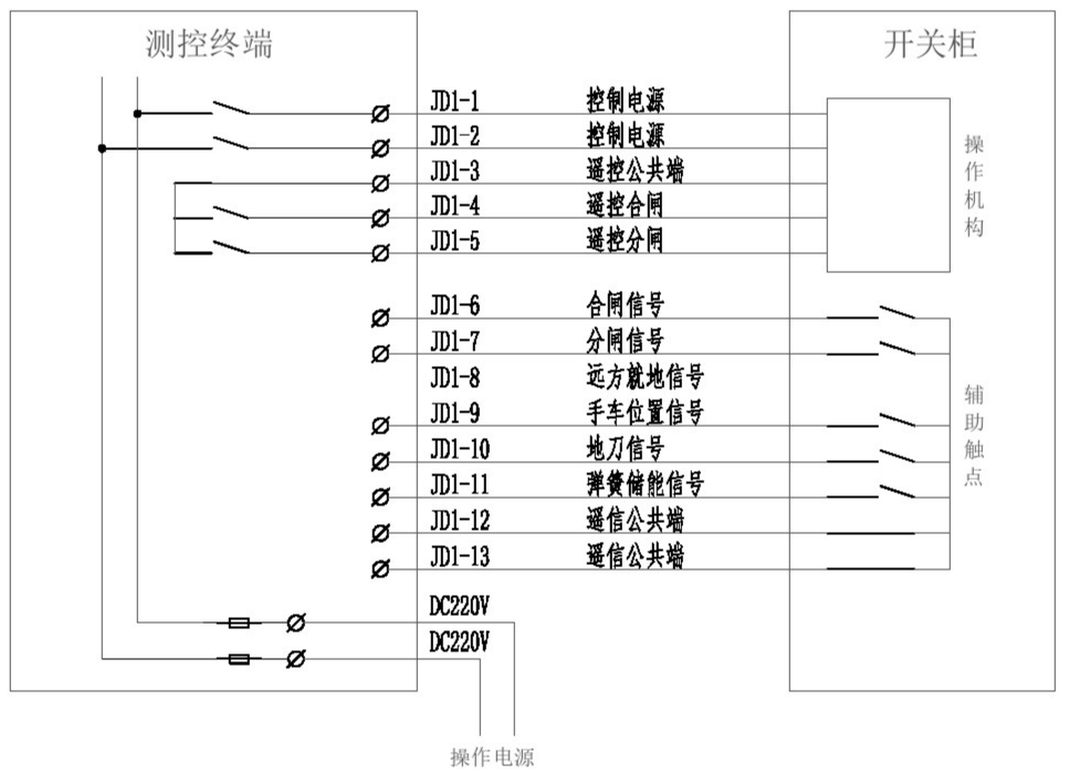 現(xiàn)場利用原開關(guān)柜(環(huán)網(wǎng)柜)的二次原理圖分別找到遙控和遙信接點(如果沒有預(yù)留接點現(xiàn)場加繼電器擴展),通過敷設(shè)的二次控制電纜將開關(guān)柜(環(huán)網(wǎng)柜)的遙控和遙信接點接入DTU測控終端回路中,實現(xiàn)遙控、遙信功能。