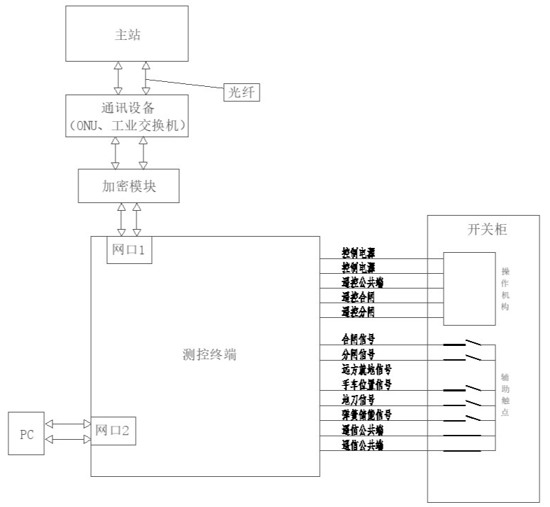 DTU測控終端采集開關(guān)柜(環(huán)網(wǎng)柜)的遙控、遙信、遙測信號,利用通訊設(shè)備和光纖將三遙信號上傳至主站從而實現(xiàn)三遙功能。