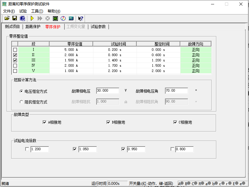 點(diǎn)擊開(kāi)始圖標(biāo)或按鍵盤(pán)上的“運(yùn)行”“確認(rèn)”鍵,繼保之星-S60 開(kāi)始輸出(做距離保護(hù)時(shí)提示打開(kāi)零序保護(hù)壓板,做零序保護(hù)時(shí)提示打開(kāi)距離保護(hù)壓板),先輸出空載狀態(tài),然后再輸出故障狀態(tài),直到保護(hù)可靠跳閘,開(kāi)入接點(diǎn)采集到動(dòng)作時(shí)間,繼保之星-S60 自動(dòng)繼續(xù)后面的試驗(yàn)直至完成所有保護(hù)試驗(yàn)并結(jié)束試驗(yàn),根據(jù)提示選擇是否保存試驗(yàn)結(jié)果。