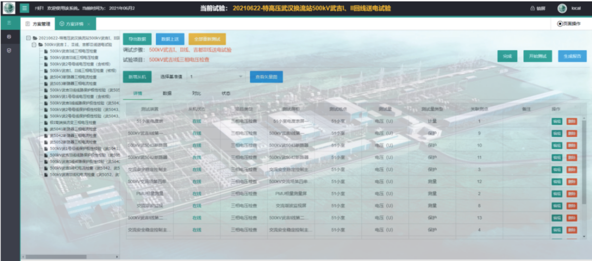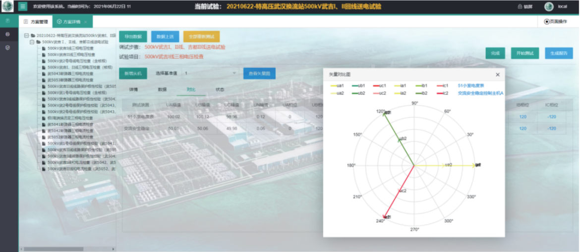 通過(guò)多點(diǎn)YD-300 后 臺(tái)系統(tǒng)對(duì)試驗(yàn)方案進(jìn)行統(tǒng)一管理,包括方案導(dǎo)入導(dǎo)出、數(shù)據(jù)同步上送、查看編輯等。 點(diǎn)擊進(jìn)入具體試驗(yàn)方案,選擇試驗(yàn)內(nèi)容、測(cè)試裝置初始參數(shù)以及從機(jī)狀態(tài)。 點(diǎn)擊開(kāi)始測(cè)試后,實(shí)時(shí)更新參數(shù),也可勾選其中兩項(xiàng)進(jìn)行差異對(duì)比可視化。 查看雷達(dá)矢量圖可直觀顯示幅值相位大小。 基準(zhǔn)值的設(shè)定和一鍵校準(zhǔn)功能減少計(jì)算誤差,設(shè)置合理誤差范圍。 變比管理控制高低壓側(cè)數(shù)值轉(zhuǎn)化,進(jìn)行合理輸出。 通過(guò)數(shù)據(jù)上送同步服務(wù)端的數(shù)據(jù)信息。
