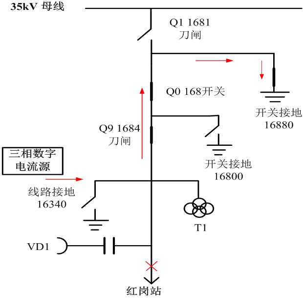 合上隔離刀閘Q9 1684,合上Q0 168開(kāi)關(guān),合上接地開(kāi)關(guān)16880,斷開(kāi)隔離刀閘Q1 1681,斷開(kāi)接地開(kāi)關(guān)16800,斷開(kāi)線路接地開(kāi)關(guān)16340,用三臺(tái)HTA-1300 單相數(shù)字式智能大電流源從35kV引線分別接入三相電流IA、IB、IC ,通過(guò)隔離刀閘1684、開(kāi)關(guān)168和接地開(kāi)關(guān)16880與IN形成電流回路。