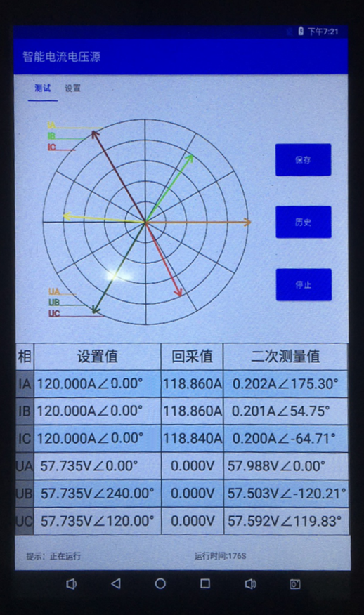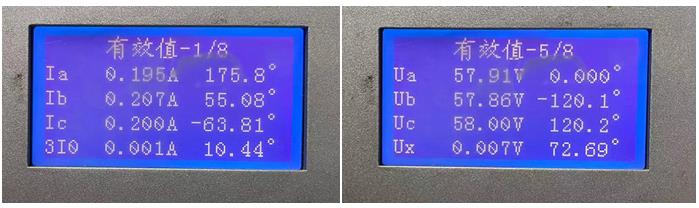 2)點(diǎn)擊開(kāi)始試驗(yàn),電流源、電壓源啟動(dòng)輸出,在YD-300 讀取相應(yīng)數(shù)值,對(duì)比保護(hù)裝置的采樣,在保護(hù)裝置查看的采樣幅值和相位與YD-300 顯示一致,由此可得,此間隔的二次回路、相序、相位、極性均正確。
