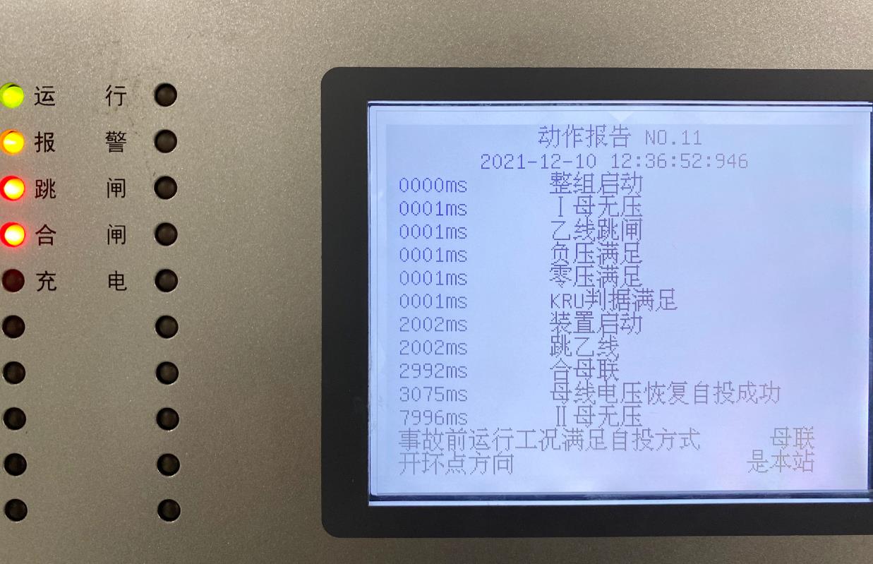 設(shè)置乙線(xiàn)無(wú)壓,兩條母線(xiàn)正常電壓,此時(shí)備自投裝置分段開(kāi)關(guān)合閘,但分段開(kāi)關(guān)DL3仍為分位,即開(kāi)出3分,乙線(xiàn)斷路器DL1為分位,開(kāi)出1分,丙線(xiàn)斷路器DL2合位,開(kāi)出2合,設(shè)置時(shí)間觸發(fā),大于整定值設(shè)置為2s。