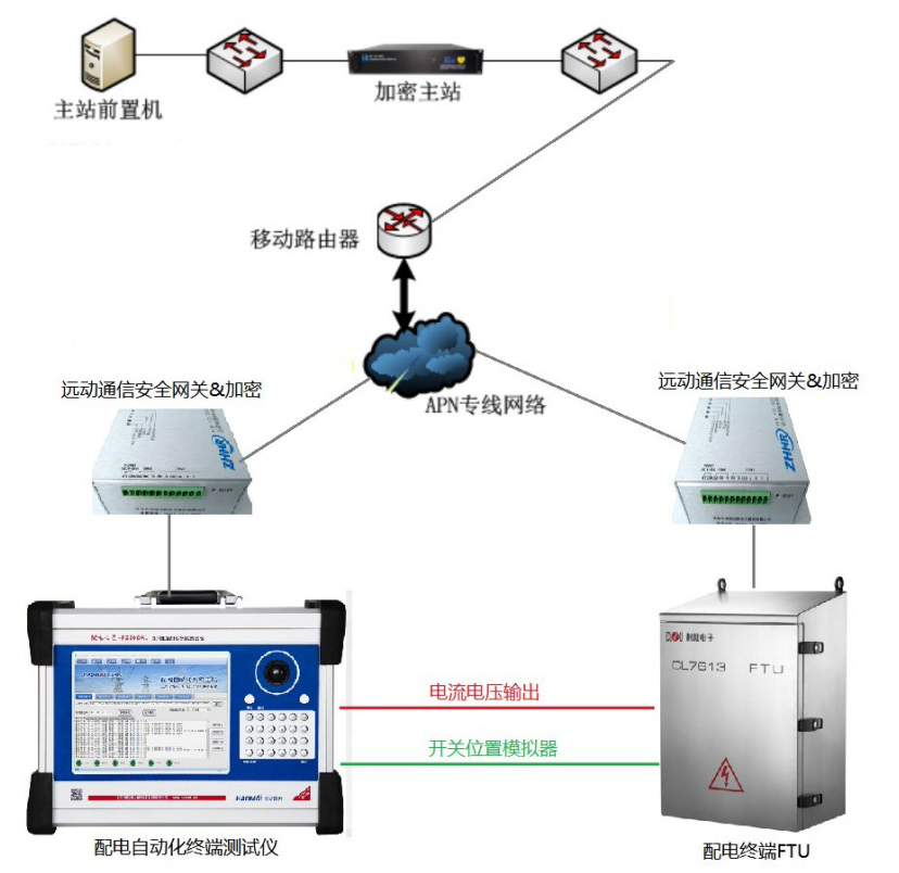 配電自動化主站與配電自動化測試儀通過無線網(wǎng)絡(luò)協(xié)議交互,配電自動化測試儀通過自動測試方案給配電終端施加不同的模擬量和狀態(tài)位置,配電自動化主站監(jiān)視到終端各種行為后,通過主站安全接入?yún)^(qū),由通信運營商無線 4G 專用網(wǎng)絡(luò),傳輸給配電自動化測試儀進行處理和運算,并給出結(jié)論。