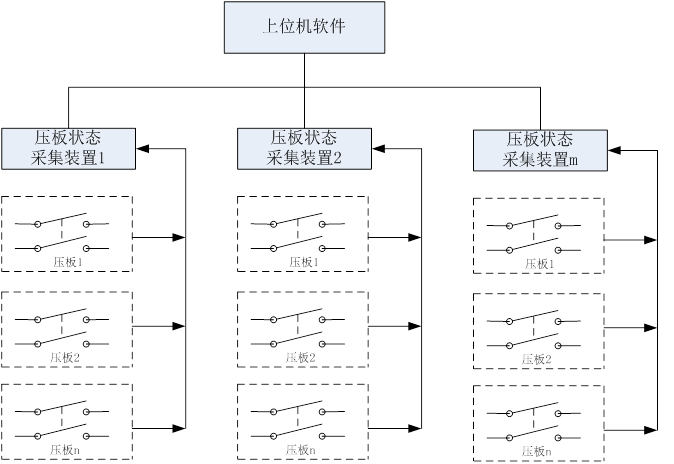 帶輔助接點的硬壓板外設(shè)輔助觸點可等效為一個接點。 壓板狀態(tài)監(jiān)測模塊一方面采集這些接點的狀態(tài),一方面集中上傳這些接點的狀態(tài)至上位機。 通過輔助接點的硬開出信號和上位機返回的報文確認硬壓板的狀態(tài),實現(xiàn)“雙確認”。