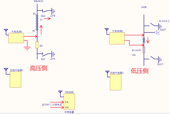 在202B 10kV線路,大電流源2從CT兩側加入大電流(從P1到P2)。