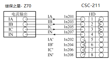 將繼保之星-Z70 的電流輸出端“Ia”、“Ib”、“Ic”分別與保護(hù)裝置的交流電流“IA”、“IB”、“IC”(極性端)端子相連;