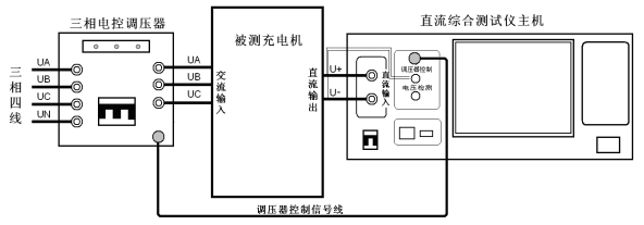 三相電控調(diào)壓器串入三相四線電源與被測充電機(jī)輸入之間,調(diào)壓器輸出接入被測充電機(jī)的輸入,調(diào)壓器控制信號線連接調(diào)壓器與主機(jī),實現(xiàn)主機(jī)對調(diào)壓器的自動控制。