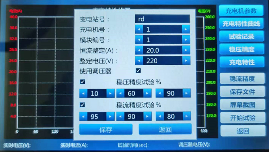 此次試驗接入了調(diào)壓器,勾選使用調(diào)壓器,在穩(wěn)壓精度與穩(wěn)流精度試驗中,裝置將自動調(diào)節(jié)至額定交流輸入電壓的85%、100%、115%。