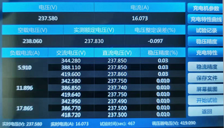 負(fù)載電流為之前設(shè)置的三個電流點,交流電壓為調(diào)壓器的輸出值,直流電壓為對應(yīng)條件輸出的直流電壓,測試儀根據(jù)實測數(shù)據(jù)自動計算出穩(wěn)壓精度。