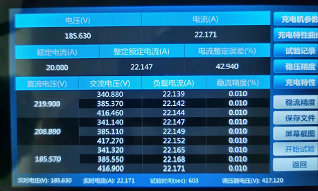 直流電壓為之前設(shè)置的三個電壓點,交流電壓為調(diào)壓器的輸出值,負(fù)載電流為對應(yīng)條件輸出的電流值,測試儀根據(jù)實測數(shù)據(jù)自動計算出穩(wěn)流精度。