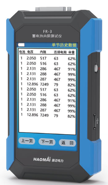 FR-3 蓄電池內阻測試儀 支持對單節(jié)/整組蓄電池的內阻和容量測試分析。 可以快速測試蓄電池內阻、電壓,對單節(jié)電池進行測試或對整組電池進行逐節(jié)連續(xù)測試,永久存儲999組電池參數(shù)。 上位機數(shù)據(jù)管理軟件提供數(shù)據(jù)管理、打印、分析、自動生成報告等功能。
