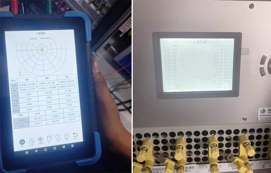 完成單個間隔的測試后停止試驗,將此間隔的接地刀閘斷開,斷路器合上,另外一個間隔同理操作,使電流從此間隔CT流向母線,到下個間隔,完成間隔間的相量測試。