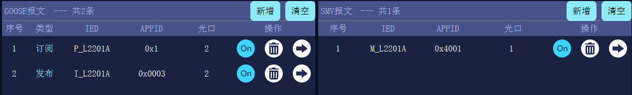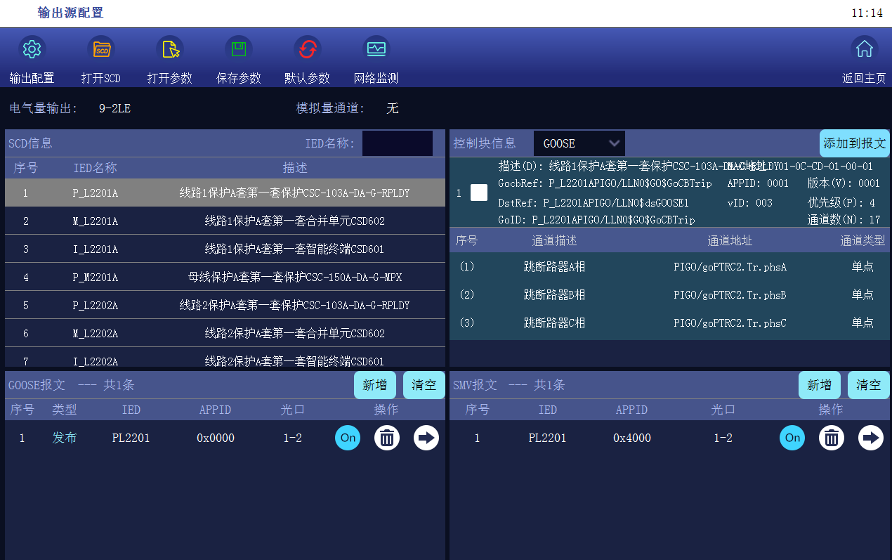 1)解析SCD文件: IEC61850打開(kāi)SCD文件,找到需要試驗(yàn)的保護(hù)裝置IED名稱,也可通過(guò)搜索IED名稱定位。 右邊控制塊信息顯示所選IED的GOOSE及SV信息,左下角顯示導(dǎo)入的GOOSE,右下角顯示導(dǎo)入的SV。