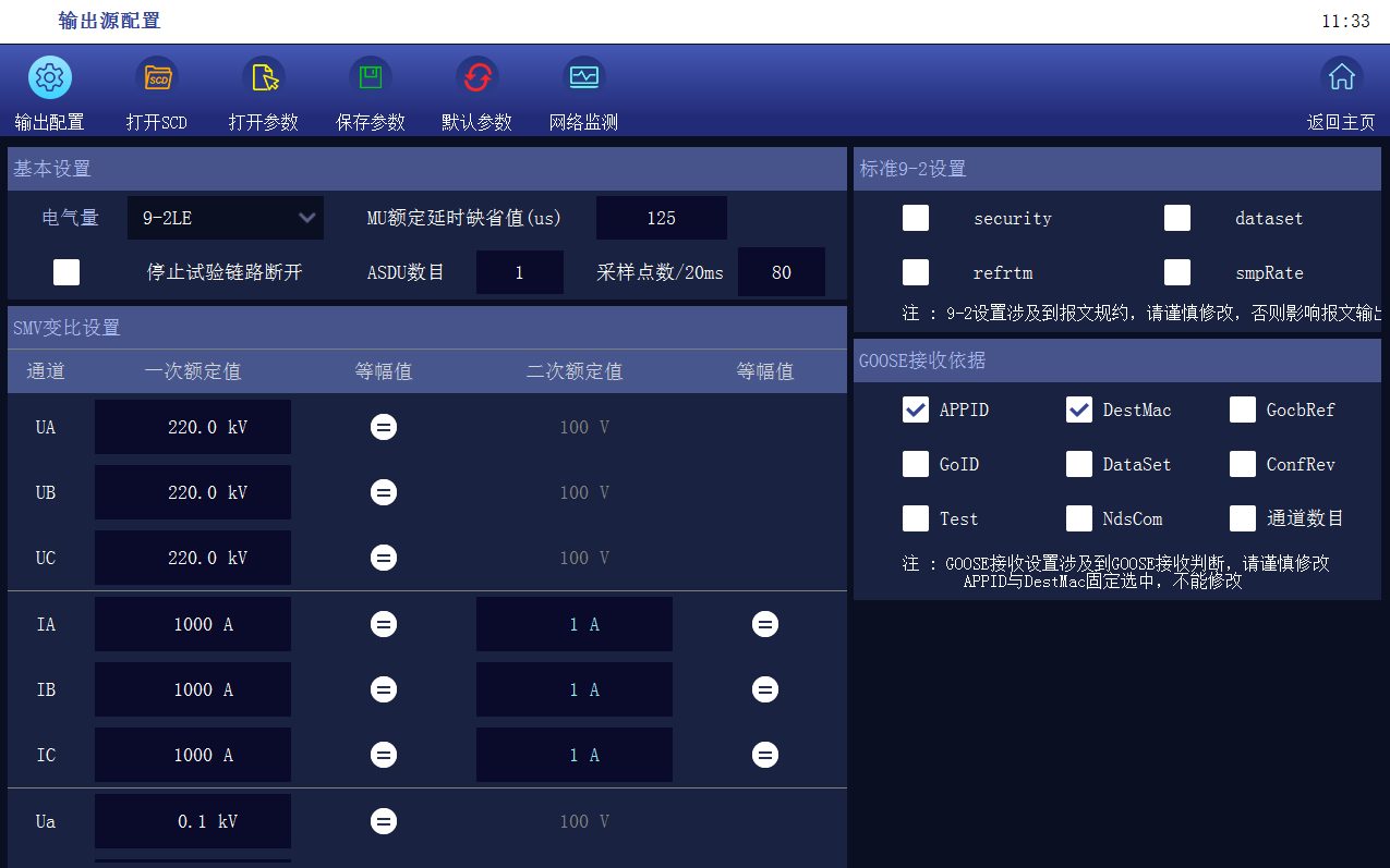 6) 在輸出配置菜單中配置SMV變比設(shè)置,此處只需更改電壓電流一次額定值,其他默認(rèn)項(xiàng)可不做修改。
