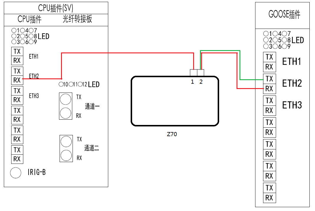 將繼保之星-Z70 光口1接入保護(hù)裝置SV板的2口,用于給保護(hù)裝置加量,光口2接入保護(hù)裝置GOOSE板的2口,用于給保護(hù)裝置施加開(kāi)關(guān)位置和采集保護(hù)裝置動(dòng)作時(shí)間。