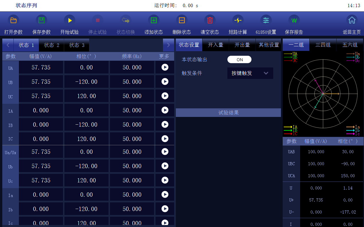 狀態(tài)1設(shè)置: UA=UB=UC=57.734V,IA=IB=IC=0A,電壓電流均為正序,觸發(fā)方式: 按鍵觸發(fā)。