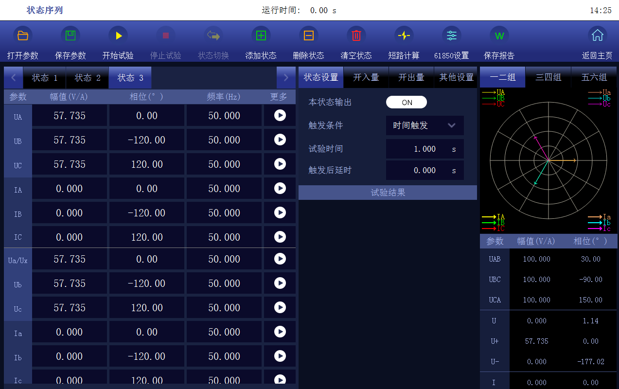 狀態(tài)3設(shè)置: UA=UB=UC=57.734V,IA=IB=IC=0A,電壓電流均為正序,觸發(fā)方式: 時(shí)間觸發(fā)1000ms。