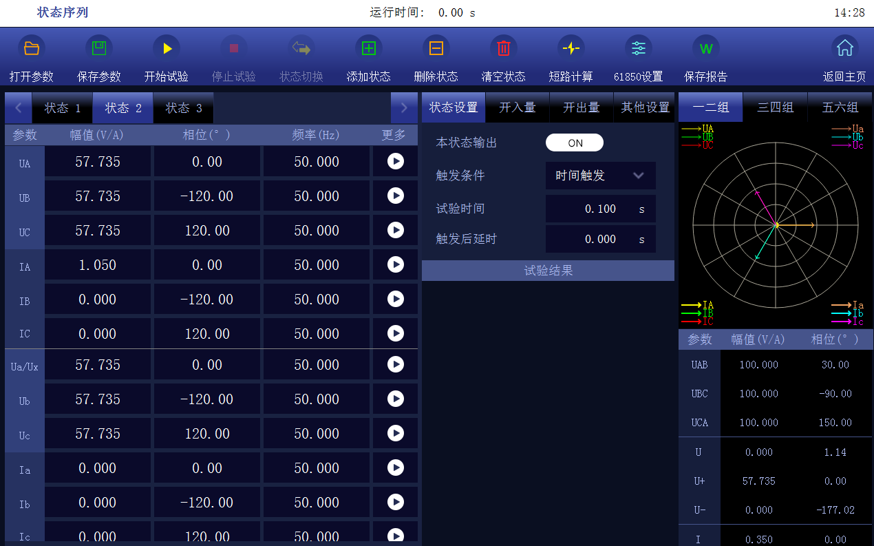 狀態(tài)2設(shè)置: UA=UB=UC=57.734V,IA=0.95A,電壓電流均為正序,觸發(fā)方式: 時(shí)間觸發(fā)100ms。